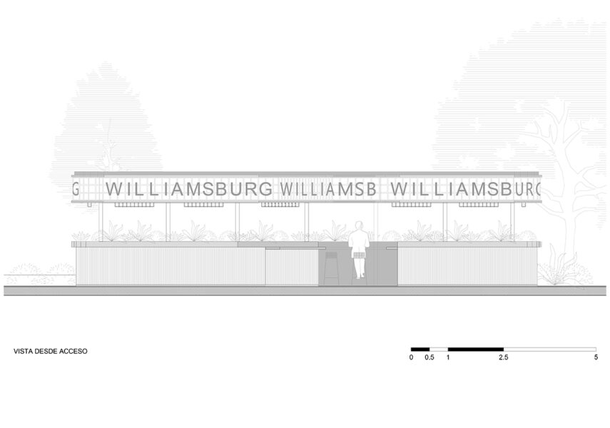 The design generates two asymmetrical façades, with one of them opening towards the street and the shops. in this way, the venue invites passers-by to stop and enjoy a meal in the dining area.