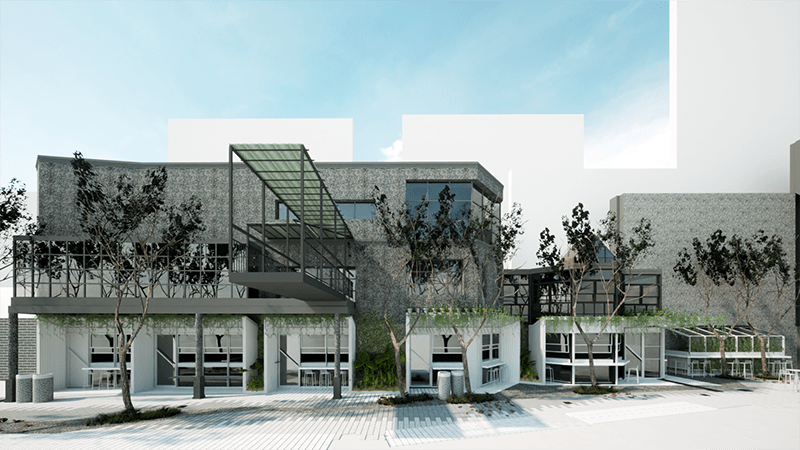 El edificio del “Paseo de la plaza” es muraría y densa, y el nuevo edificio que denominamos “cinta” es ligero y de chapa. Esta pieza se eleva del nivel del suelo, entre canteros vegetados, conteniendo 10 fachadas de locales comerciales diseñados como ventanas de los antiguos bares de la acera. Su mobiliario frente a las ventanas está resuelto a través del mismo lenguaje.