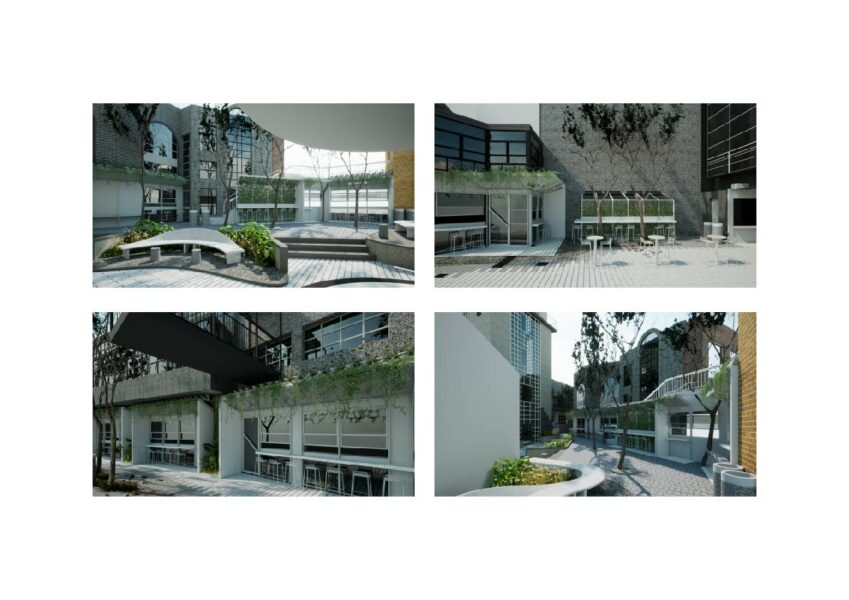 La estrategia ha sido mantener la heterogeneidad de sus edificios en su aspecto tectónico y formal, pero hemos ejecutado una homogeneización de sus volúmenes implementando tonos oscuros, de manera que el edificio que define el nuevo uso, » el mercado» se diferencia, no sólo por sus tonos claros, sino también por su tectónica.